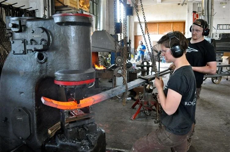 Blacksmiths Annie Arthur and Matthew Garton at Robert Thomas Iron Design guide a partially molten piece of iron, weighing more than 100 pounds, through a power hammer at the workshop in North Charleston.