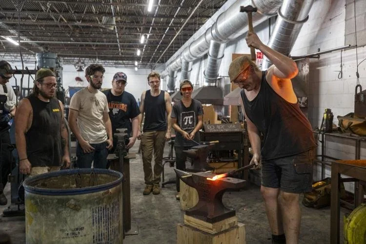 Matt Garton (right) does a demo for one of his classes in the American' College of the Building Arts new Blacksmithing Workshop.